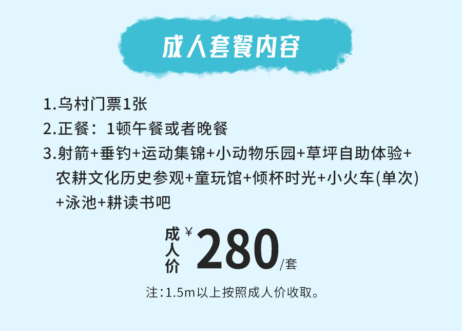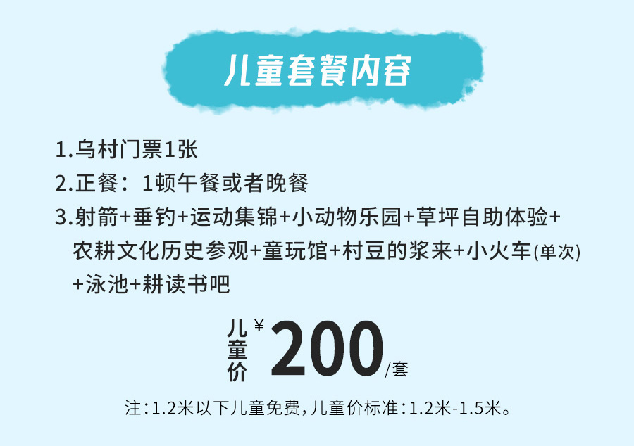 该套餐仅限当日有效,不能重复使用,乌村开放时间夏令9:00-17:30,冬令9:00-17:00;
