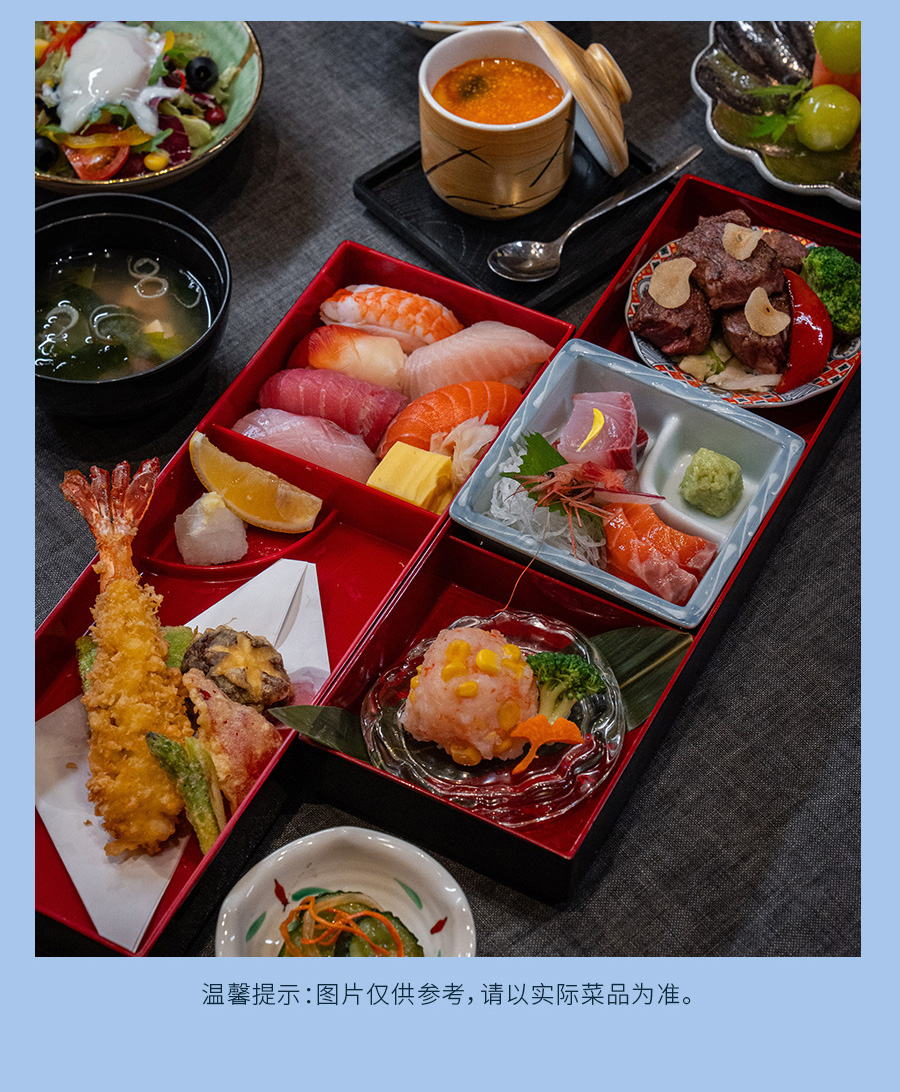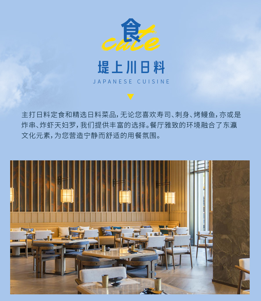 堤上川日料:11:30-14:00,17:30-00:00 :《三文鱼情人》海胆 三文鱼 牛油果最中饼、《镜花水月》樱花刺身拼盘、《埃菲尔铁塔上的新郎新娘》 花嫁新娘彩色色拉、《暗影》竹炭味增酱烤银鳕鱼、《瞧!这个人》雪花和牛铁板绣球菌、《带小狗的女人》三文鱼奶酪寿司卷、《看不见的城市》甜蜜菠萝焦糖布丁;