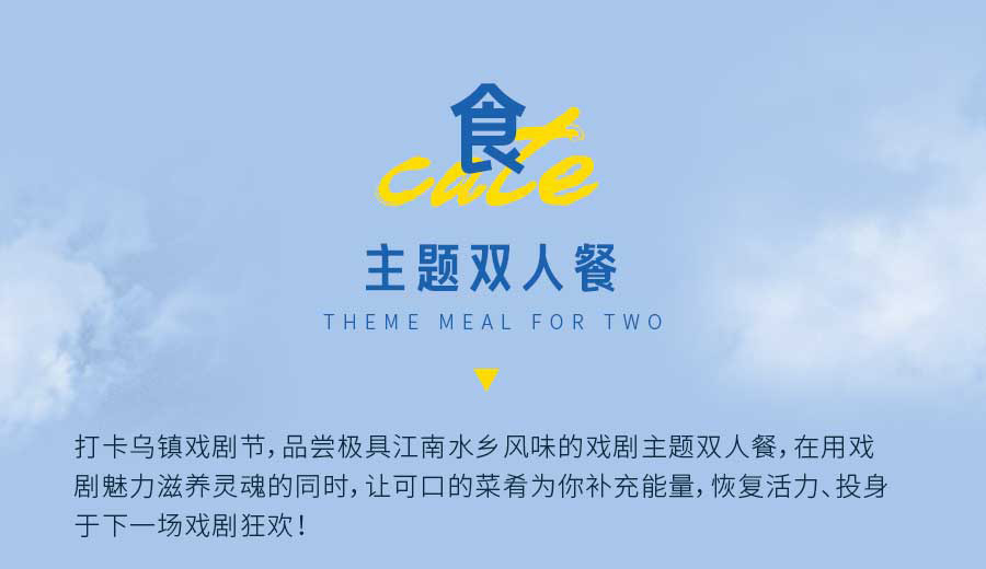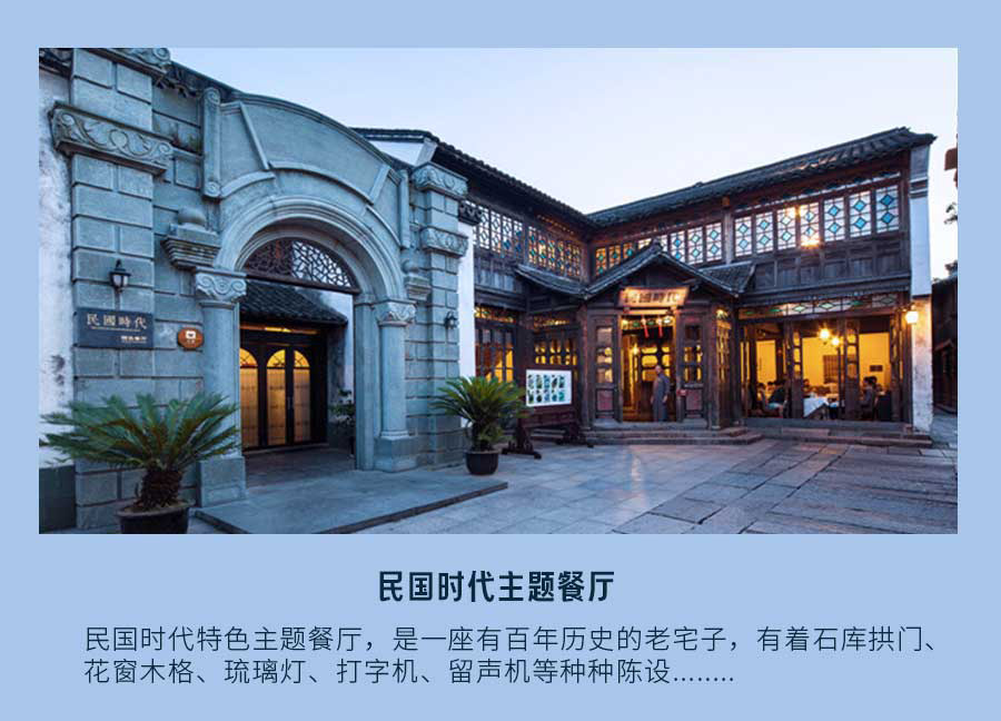 民国餐厅:11:00-14:30,17:00-20:30(戏剧民国风情):《浪浪山小妖怪》花雕醉蟹配时蔬沙拉 、《乌镇潮韵》传统酒糟浸河虾、《断枝》万兴桥头脆排骨、《鸡蛋黄,鸭蛋白》芹香干贝芙蓉蛋、《地坛公园的秋天》荷塘炒双脆、《丝语攻瑰》玫瑰酒酿圆子、《吉祥三宝》当季鲜果三味拼(例);