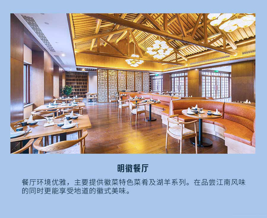 明徽餐厅:11:00-13:30,17:00-20:00(镜花水月套餐);国乐素香油茶汤、扶摇戏梦臭鳜鱼、克隆须眉酱香鸭、环湖浓汤山野笋、工坊清炒时令蔬、时令水果嘉年华;