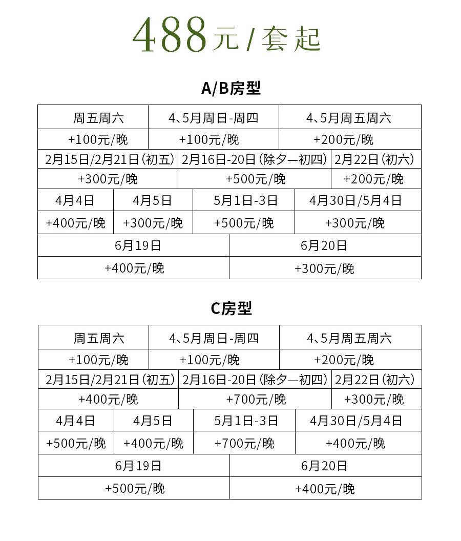 A/B房型:周五周六补差100元/晚,4、5月平日补差100元/晚,周五周六补差200元/晚。