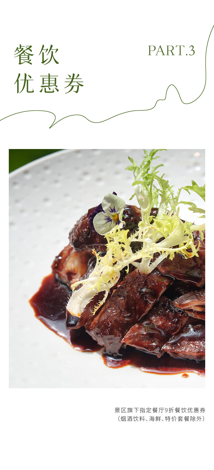 景区旗下指定餐厅9折餐饮优惠券,适用餐厅“通安何家小馆、枕水芙蓉中餐厅、明徽餐厅、民国时代餐厅”,烟酒饮料、海鲜、特价套餐除外;
