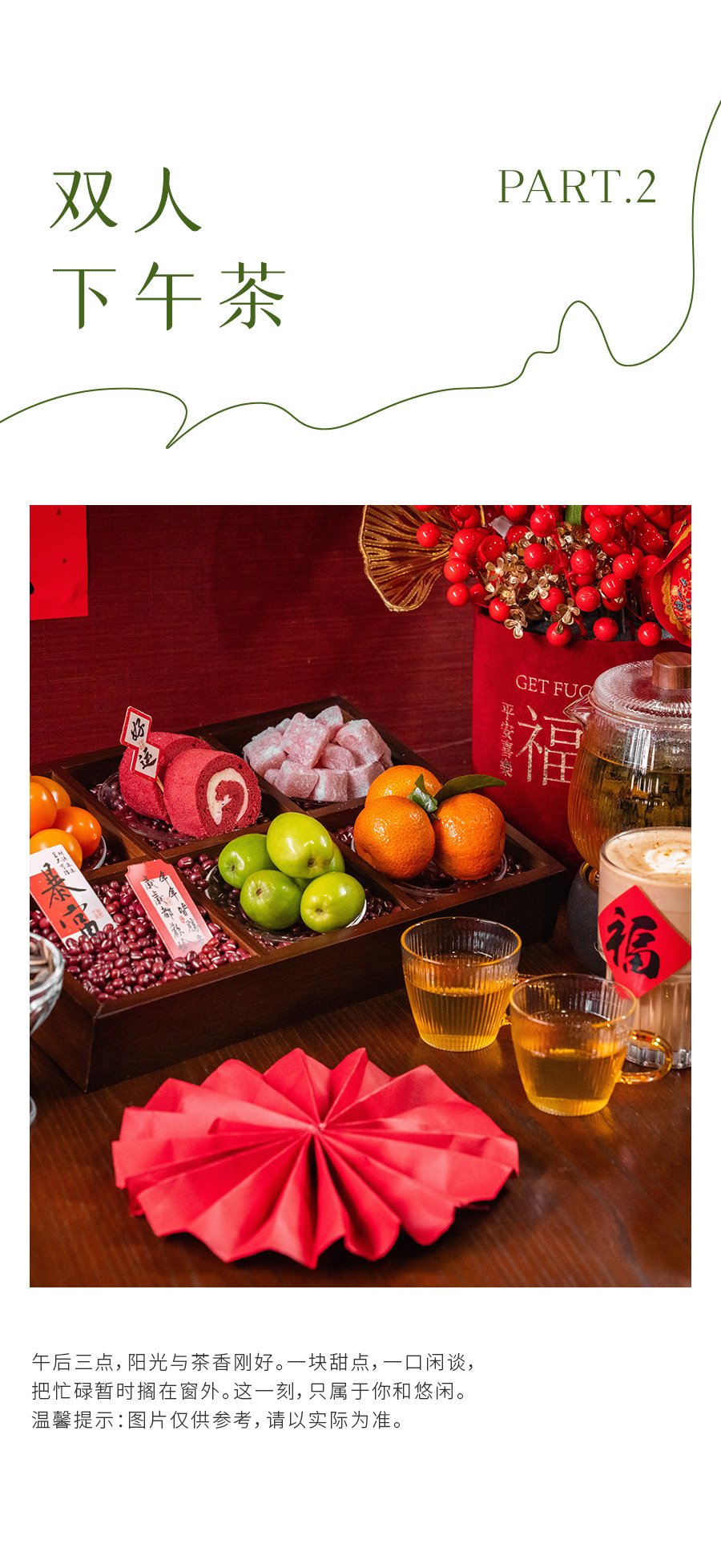 通安景行枯双人下午茶菜单:饮品:拿铁咖啡1杯、菊花雪梨1杯;甜品:黑森林蛋糕1份(2块)