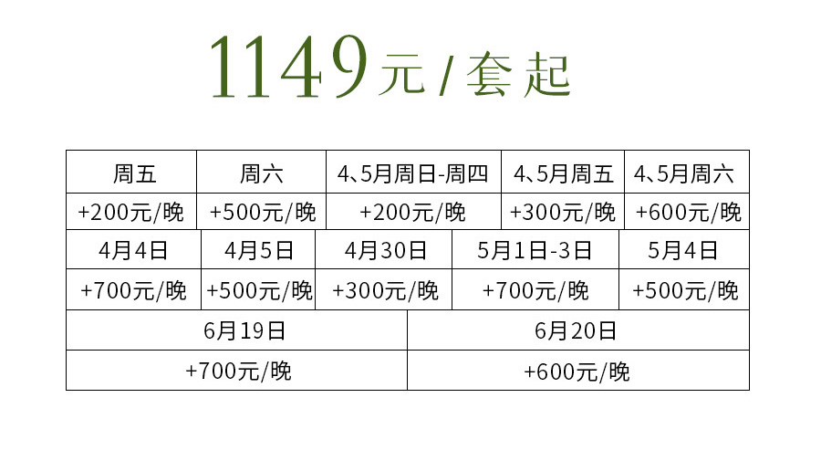 补差政策:周五补差200元/晚,周六补差500元/晚,4、5月平日补差200元/晚,周五补差300元/晚,周六补差600元/晚。