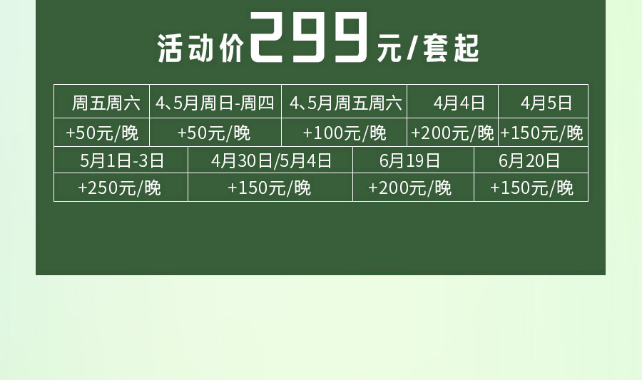 补差政策:周五周六补差50元/晚,4、5月 周五周六补差100元/晚;
