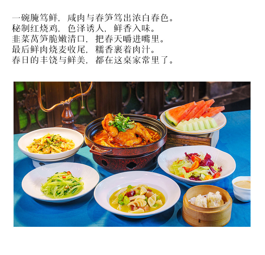 民国餐厅:11:00-13:30,17:00-20:00,菜单:酱香鸭拼马兰头、雪菜笋丝太白虾、古法焖香鸡(半只)、风肉时春腌笃鲜、时令春韭莴笋丝;