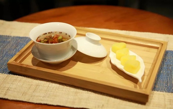 集颜值与口感为一体,香气四溢的熏豆茶,绝对是水乡人民最佳发明之一。这是一道以熏豆为主料、其余辅料一齐冲泡而成的传统茶点。熏豆清香有嚼劲,加上熟芝麻、陈皮、胡萝卜干等物,冲出的熏豆茶缤纷多彩、酸咸适口,极为解渴。三伏天,暑气正盛时,找不到冰可乐,就来一盏温热可口的熏豆茶吧,将茶水饮尽后,还能吃掉茶盏中的熏豆、芝麻和胡萝卜丝,顺便补充体力。